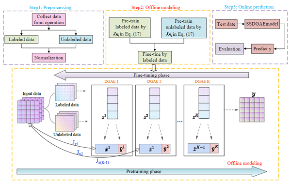团队首先引入了一种新的堆叠双引导自编码器(SDGAE),以更好地表征复杂的数据模式并学习质量相关特征。与SAE相比,SDGAE的思想在于堆叠一系列分层双引导自编码器(DGAE),旨在使每个DGAE能够准确地重建原始输入数据。它还通过引入监督项使模型能够同时提取与输出变量高度相关的特征。此外,实际场景通常涉及有限的标记数据和大量未标记数据,这使得网络缺乏足够的泛化能力。为了解决这一困境,我们进一步提出了一种深度半监督堆叠双引导自编码器(SSDGAE),它能够在预训练阶段从无标签数据中获得有用的特征表示和结构信息,这与SDGAE能够做到的从有标签数据中获得信息相辅相成。在杨泽宇导师的指导下,学生积极参与SDGAE和SSDGAE模型的设计和实现工作。他们通过编程将理论转化为实际的算法,并进行了多次调试和优化。