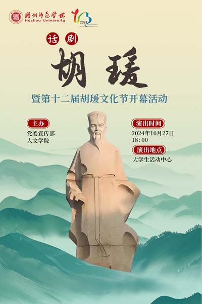 自2018年起,人文学院启明剧社,以传播胡瑗教育思想、承扬“明体达用”校训为宗旨,创作并演绎了话剧《胡瑗》,通过扎实的剧本,精彩的演绎,契合的舞美音效设计,既展现胡瑗先生卓越的教育理念和无私奉献的精神,又能引发观众的共鸣和思考。六年来,《胡瑗》话剧不断被演绎、打磨、传播,已成功上演十余场,吸引了近万名观众,产生了广泛的社会影响,成为校园原创文化建设的优秀成果。2020年“启明剧社”获评首届文化“白天鹅奖”文化建设奖,2023年话剧《君子胡瑗》获评第三届文化“白天鹅奖”文艺创作奖,同年参与了湖州市新闻传媒中心纪录片《瑗来是湖州》的拍摄以及央视九套纪录片的拍摄,在传承历史,纪念伟人的同时也紧扣时代脉搏,感动着一届届湖师青年。