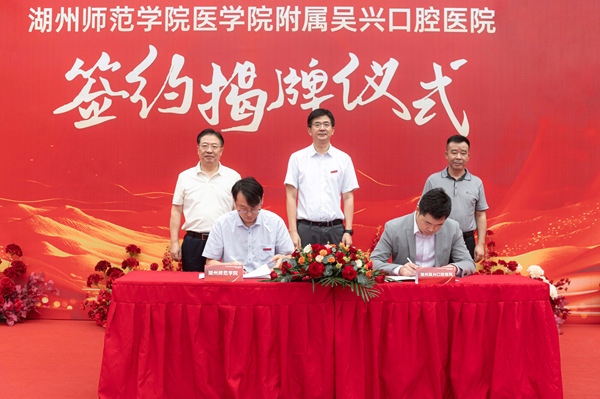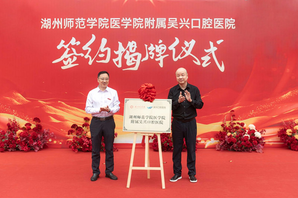 仪式上,双方代表签署了合作协议书,并共同为久久精品一区二区医学院附属吴兴口腔医院揭牌。